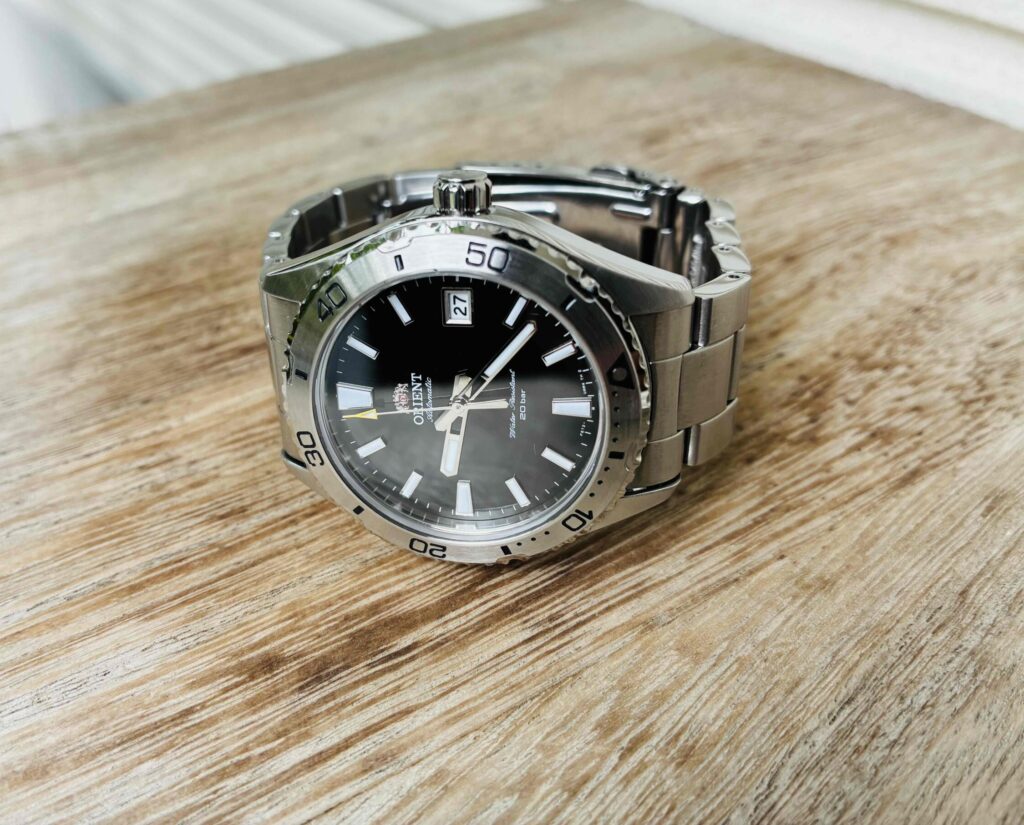 購入価格は3万円前後にもかかわらず、黒のサンレイ文字盤とメタルバンドの質感が非常に高く、よく「その時計、どこのブランド?」と聞かれます。