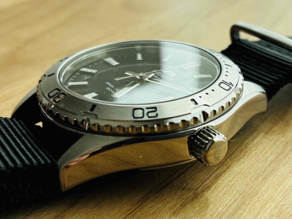 本格的なダイバーズウォッチではないものの20気圧防水を備えており、急な雨や予期せぬ水濡れにも余裕で耐えられるため、シチュエーションを気にせず安心して着用が可能です。