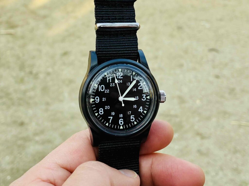 デザインはミリタリーウォッチらしいシンプルな文字盤構成で、視認性もまずまず。数字が大きく、パッと見て時刻を把握しやすいのが特徴です。夜光塗料は控えめで、暗所での視認性は本格時計ほど期待できませんが、価格を考えれば十分でしょう。