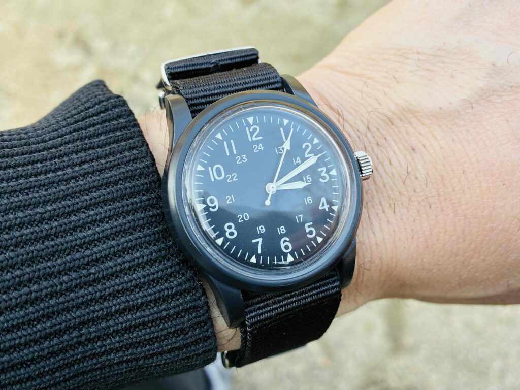 付属のNATOストラップは、価格相応で少しペラペラ感があり、やや短めなのが少し不満ではありますが、その分カジュアルな雰囲気がしっかり出ており、ミリタリー感を楽しめます。